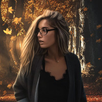 something in the distance, giving her a contemplative or pensive expression. Her attire includes a top that has a slightly darker tone than the rest of her outfit, which could be due to lighting or