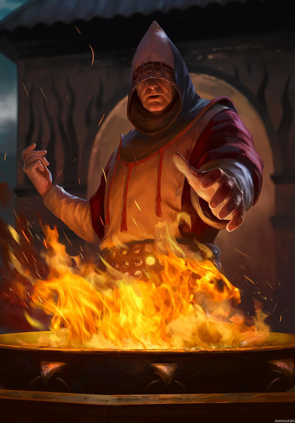medieval attire, suggesting they might be a wizard or alchemist given the context of the scene with fire. The character appears to be focused on some task involving flames and possibly mixing ingredients or casting a spell. The setting looks like