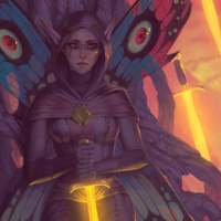mythical being. They are holding a sword in one hand, indicating they may have some level of