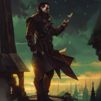 fashioned clothing, including a cape and a hat, with a pistol at his side. His expression appears to be focused or intense. In the background, there's a view of a dark and gothic environment that resembles a dungeon or an underground cave with