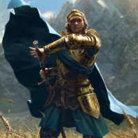 a male warrior or knight, dressed in armor with blue and gold accents. He is holding a sword and a shield, suggesting he might be engaged in combat within the game. His pose gives