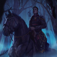 the back of a horse, seemingly in a dark or nighttime setting. The rider appears to be wearing armor and holding a weapon that could be a sword or a similar