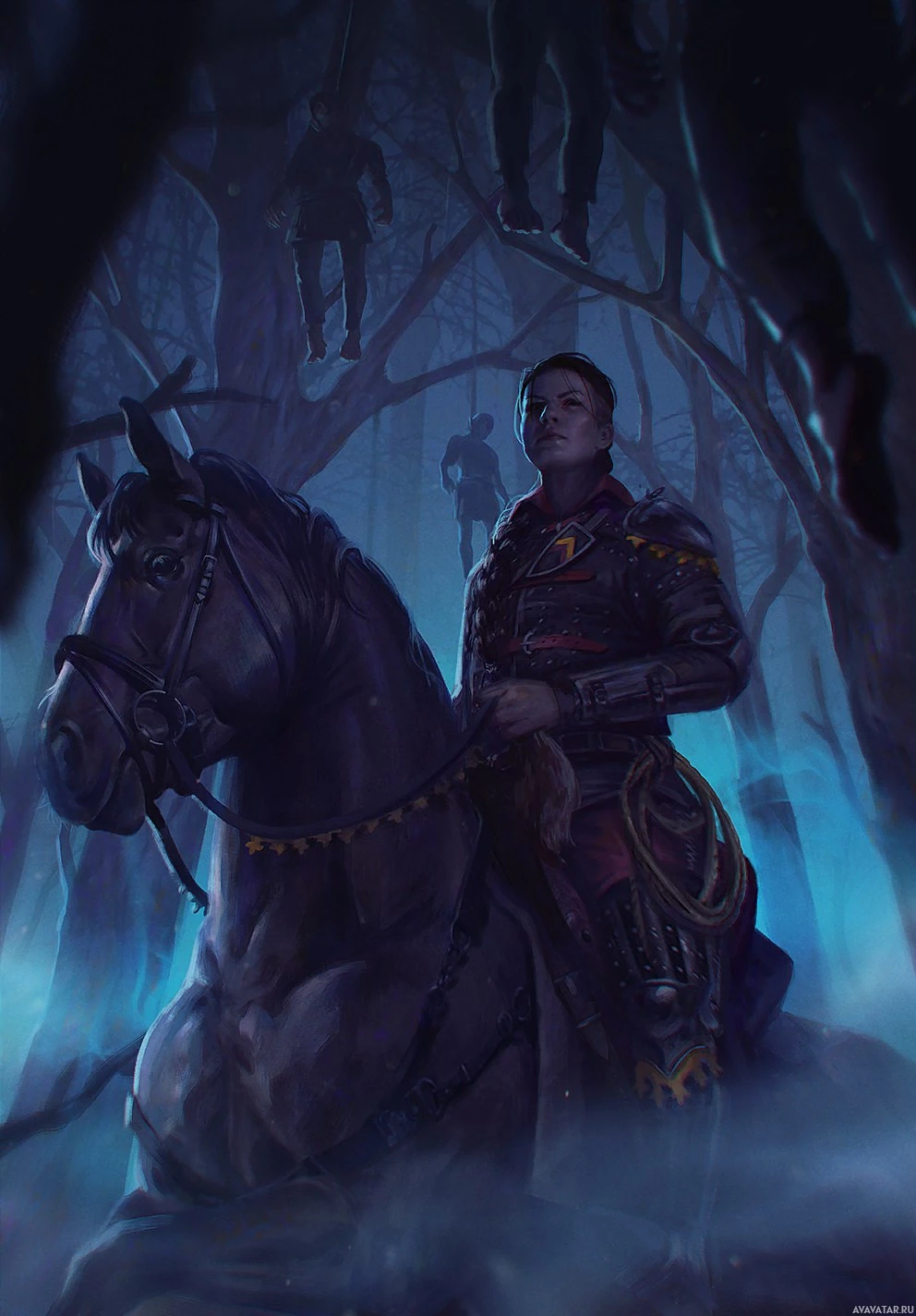 type of weapon. In the background, there are silhouettes of people hanging from trees, suggesting