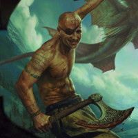a large axe in one hand and what seems to be a scimitar or sword in the other. The setting appears to be outdoors with dramatic clouds in the sky, suggesting an action-