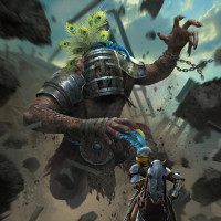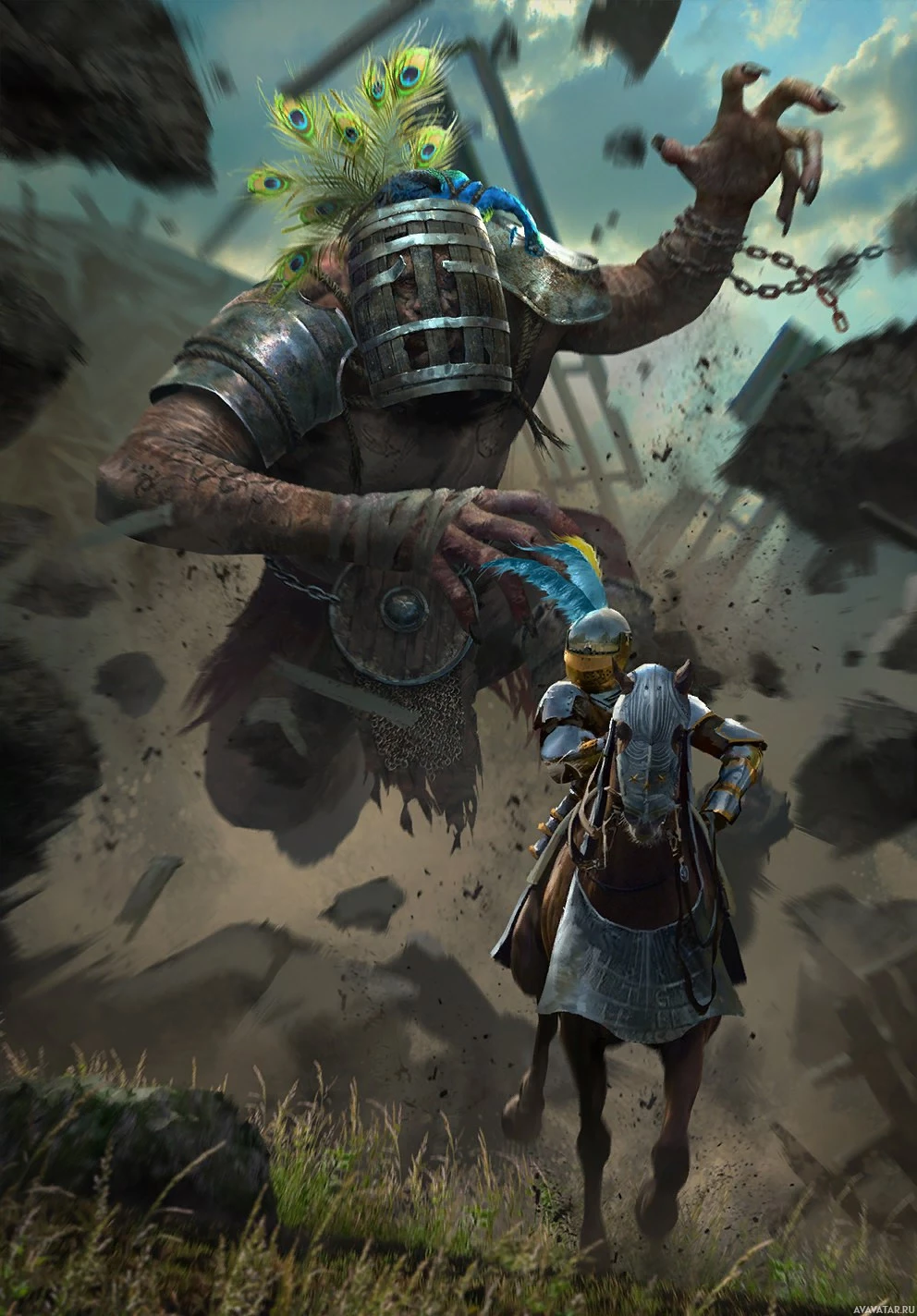 character on horseback is holding a crossbow at the ready and appears to be in mid-combat with a massive creature that resembles a giant bat or an oversized bird, given its large wingspan and feathered appearance. The setting suggests a battle taking place during the daytime against a backdrop of