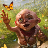 an animated character that appears to be a child with pale skin, dark hair, and large round eyes. The character is wearing ragged clothes and has a somewhat