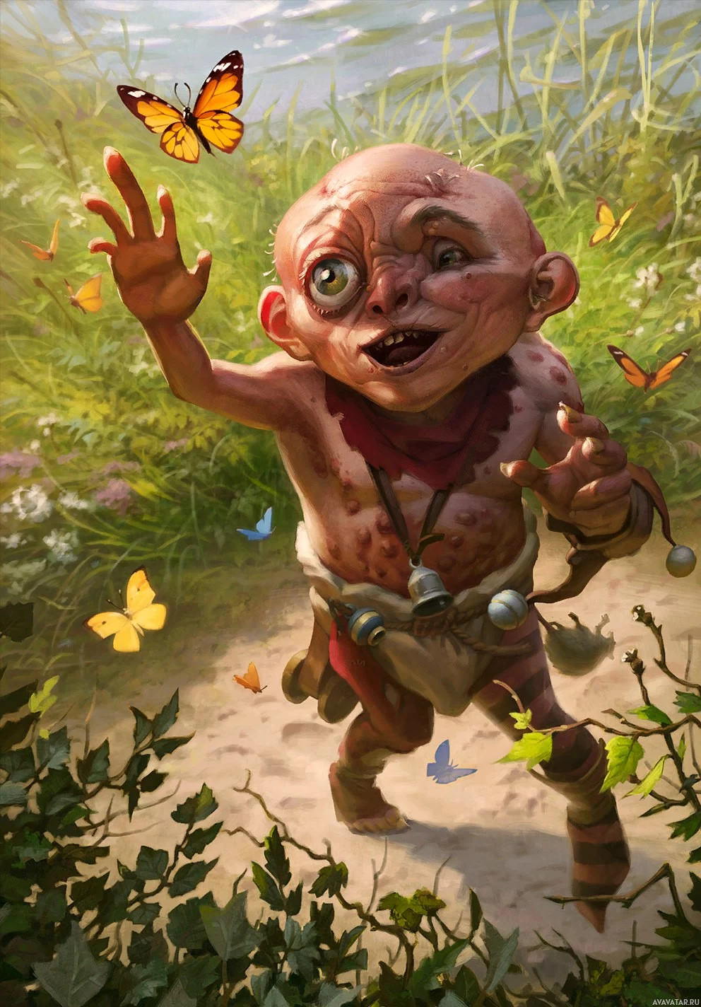 a grassy area near water, with butterflies flying around them. There's also