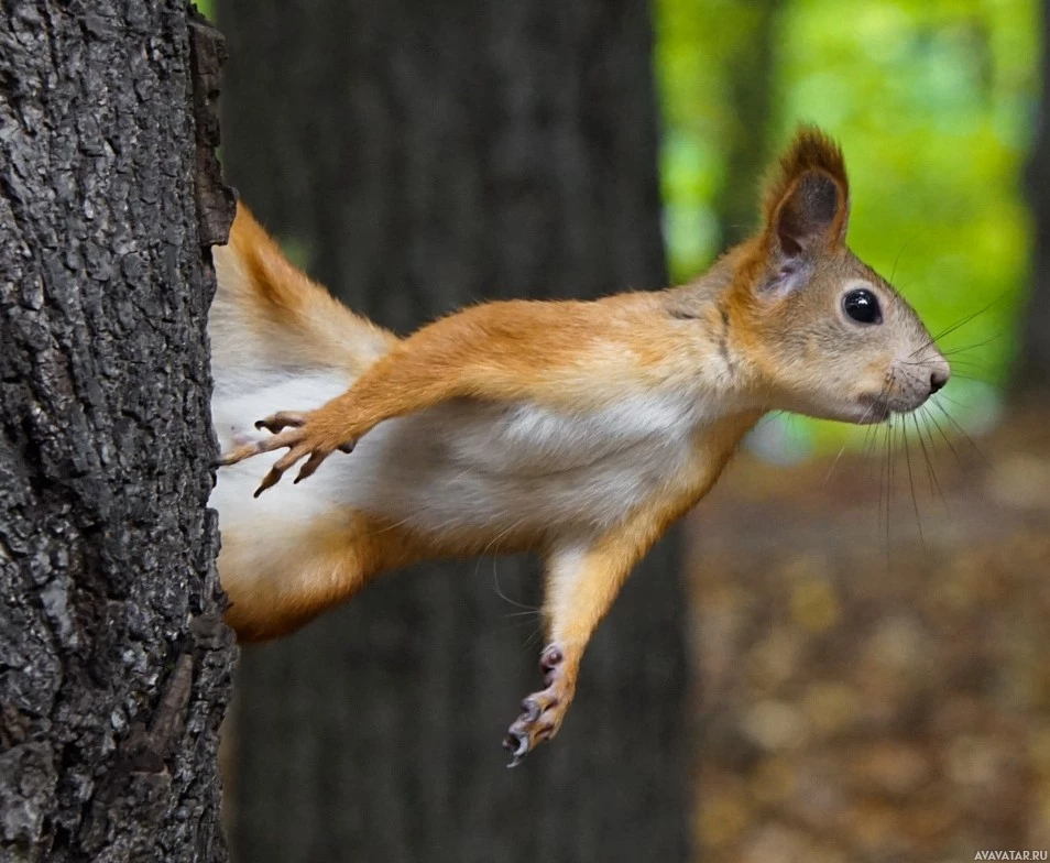 На снимке изображена белка, которая является животным. Кажется, что он находится в движении, возможно, поднимаясь вверх или вниз по стволу дерева. Белка имеет передние лапы на коре, и ее тело слегка наклонено к нам, когда она перемещается по дереву.