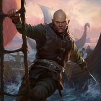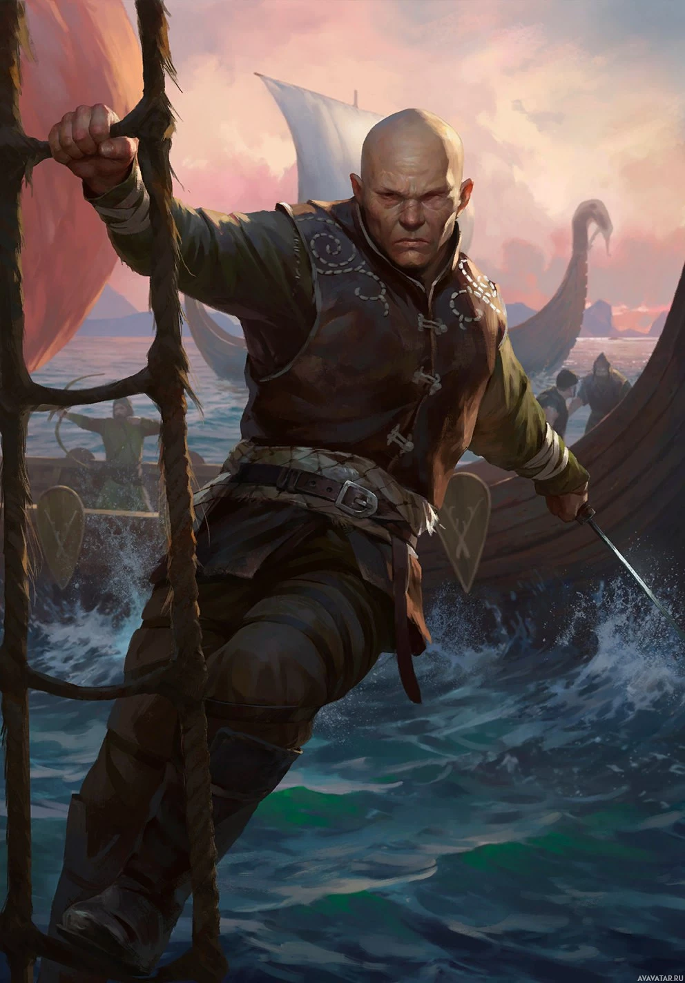 Viking Age. The character appears to be on the bow of a longship, possibly about to embark or disembark from it. The background shows an oceanic scene at sunrise or sunset, with