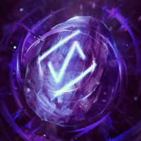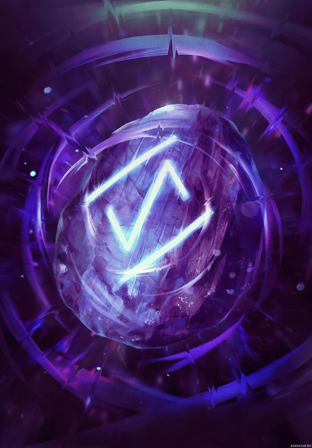 video game and media franchise. In the center of the image, there is a large glowing blue gemstone or crystal with a purple hue that seems to radiate some sort of