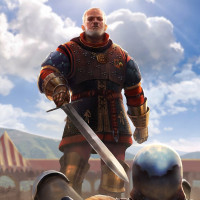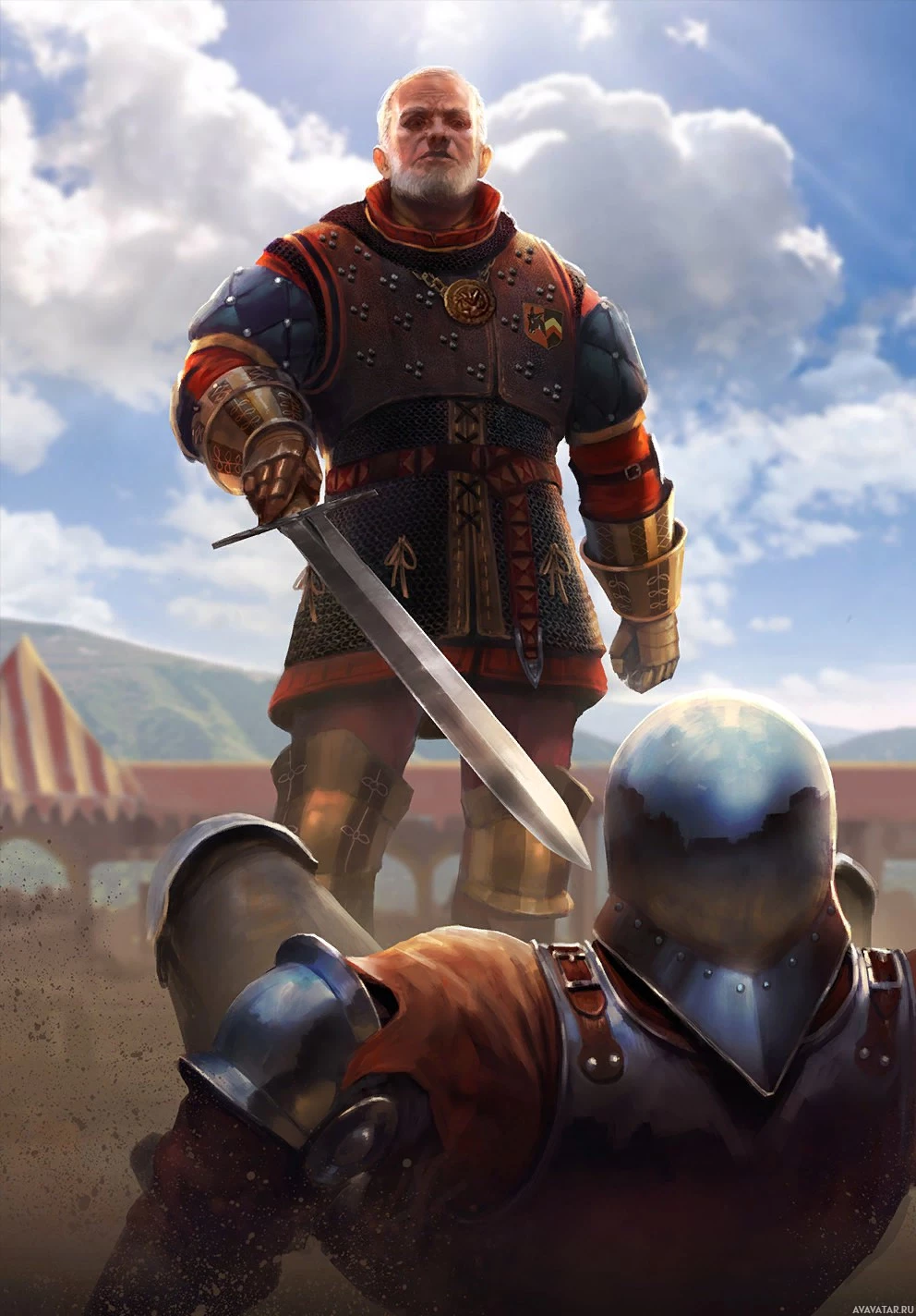 graphic novel-like art style. On the left, there is an older warrior or knight wearing armor and holding a sword. He appears to be standing on a battlefield with