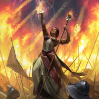 intense action, featuring fire, smoke, and various characters that appear to be engaged in combat. The scene captures the epic fantasy elements of the game, showcasing the character's role as a leader or strategist amidst a tumultuous battle.