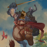 sharp teeth, which could be an ogre or a similar monstrous being. To the left side of this creature, there is
