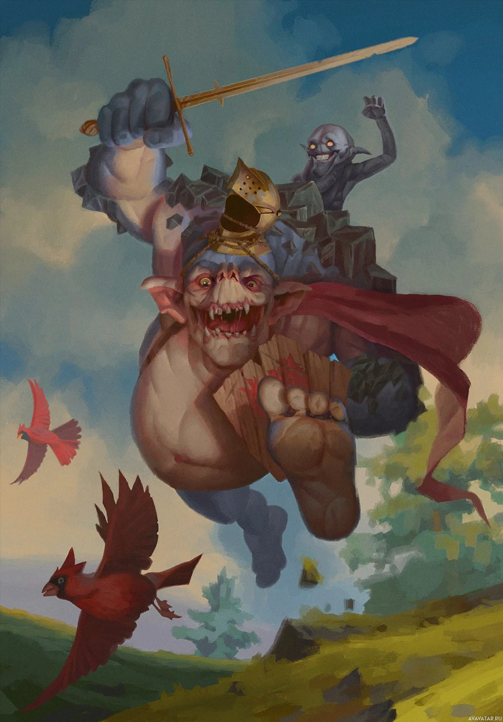 a red bird in mid-flight. Above and to the right, there is another character riding a horse; this character has a sword at their side and appears to be armored for battle, suggesting they might be a knight or warrior. The background features a serene landscape with trees and