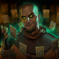 a bald head, wearing what appears to be a mage or wizard robe. He has his hands outstretched and is surrounded by numerous cards that are floating in mid-air. The cards feature