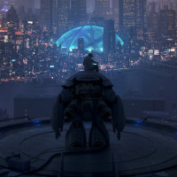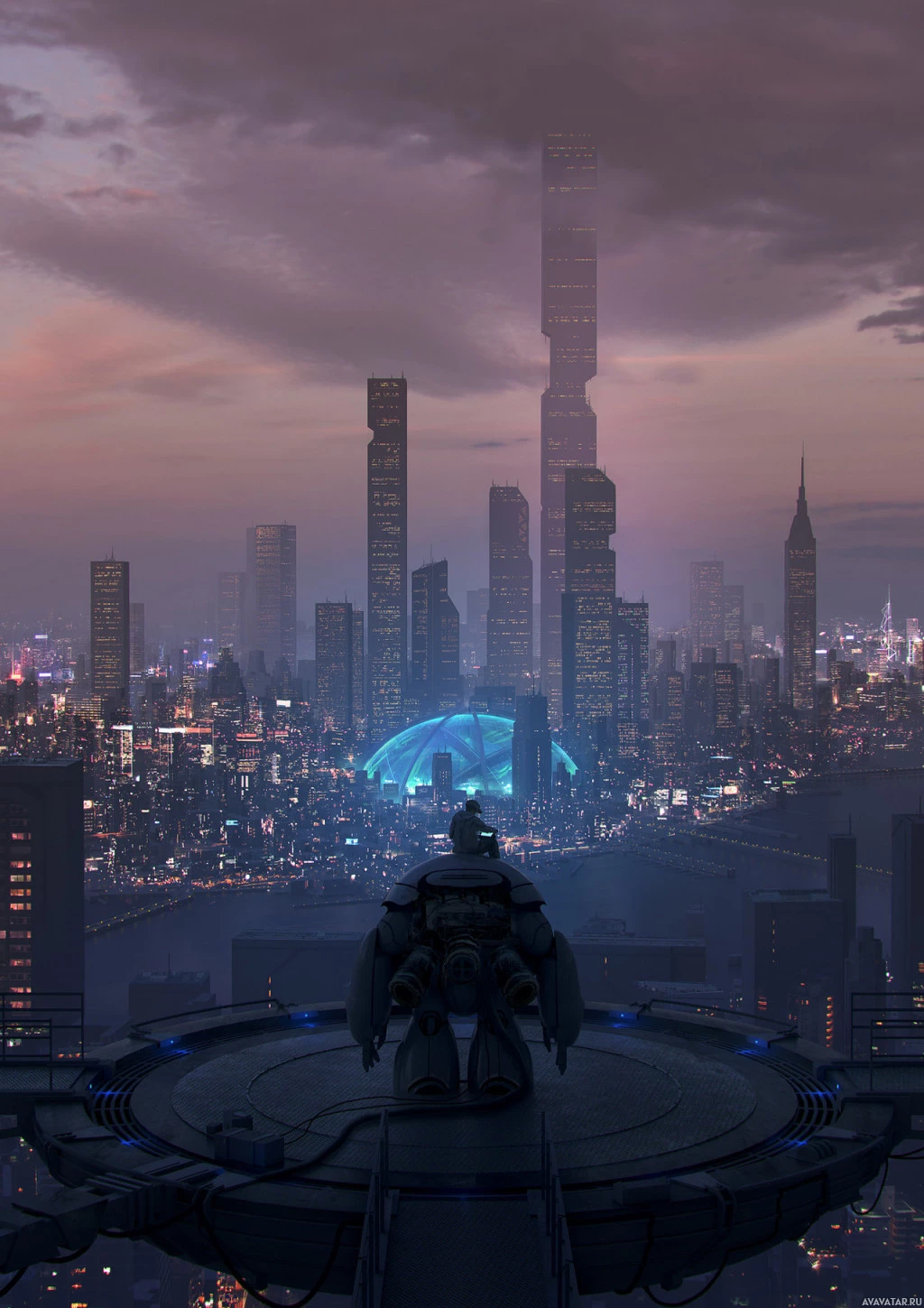 a science fiction scene set in a futuristic cityscape. In the foreground, there is a character who appears to be sitting on a platform or ledge overlooking the city. This character has a robotic arm and seems to be contemplating