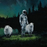 This is an image featuring an astronaut standing next to two sheep in a night-