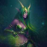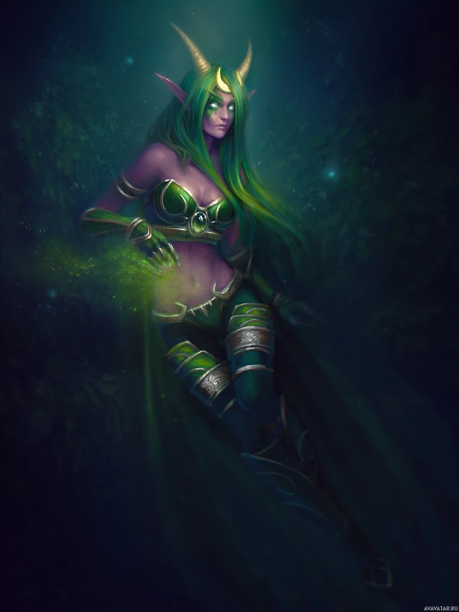 green skin, pointed ears, and is wearing a green and black outfit with what appears to be armor or body gear. Her hair is flowing, and she has