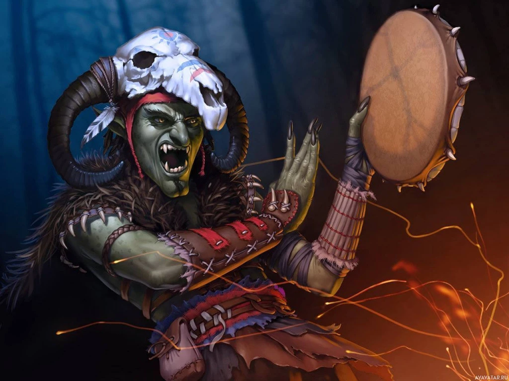 green skin, large ears, and pointed teeth, which are typical characteristics of goblins in various mythologies and fantasy stories. It's wearing a helmet or mask with bull horns on it, suggesting an aggressive or warlike nature. The goblin also has a drum or round shield-like item in its hand that it seems to be striking, which might imply that the creature is engaged in some form of ritualistic or war-related activity. The setting appears to be outdoors at night or in a dimly lit area, adding to