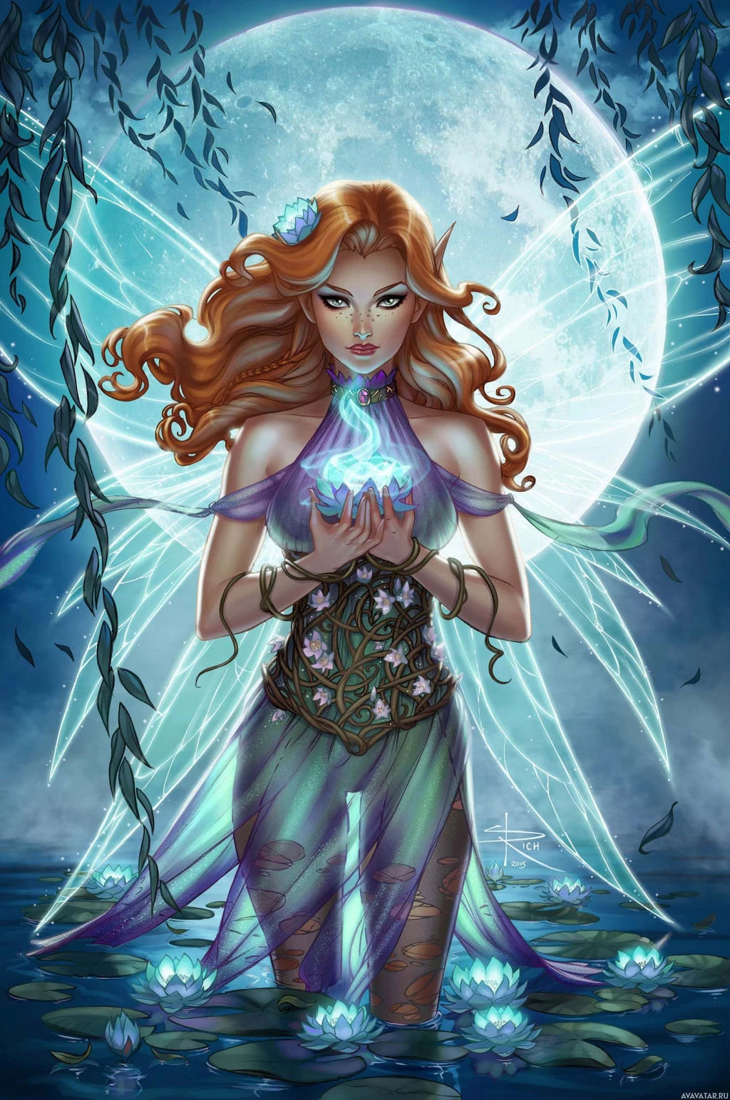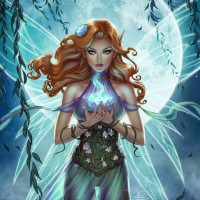 a soft glow across the scene, creating an atmosphere of mysticism or enchantment. Below the woman are floating flowers and lily pads, contributing to the magical ambiance. The overall effect is one of serene beauty and otherworldly charm, fitting within the fantasy genre's aesthetic.