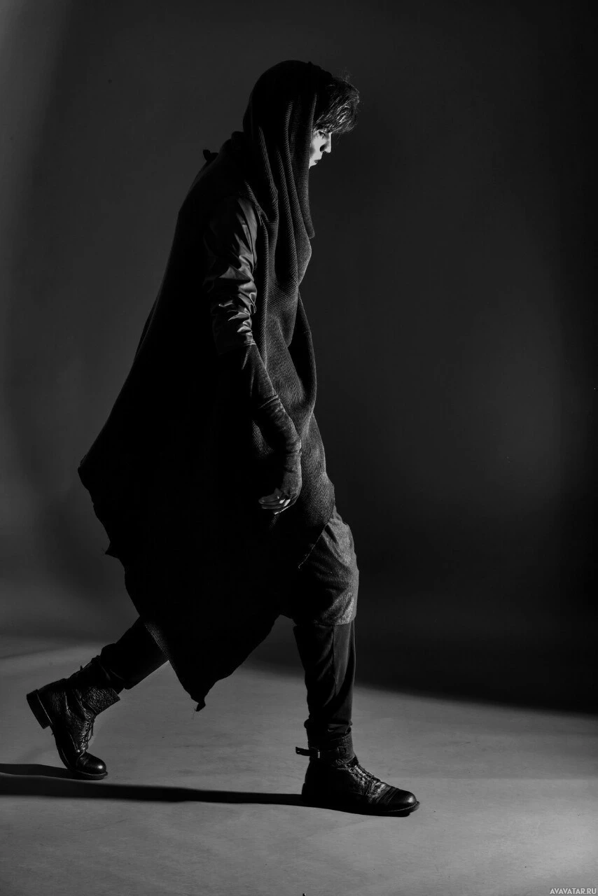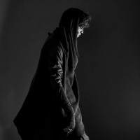 dark clothing that appears to be loose and flowing, perhaps suggesting a robe or similar garment. The individual's face is not visible as they are wearing what looks like a hood or mask that covers their head and neck area, leaving only their hands and lower body exposed. The lighting in the photo creates