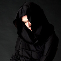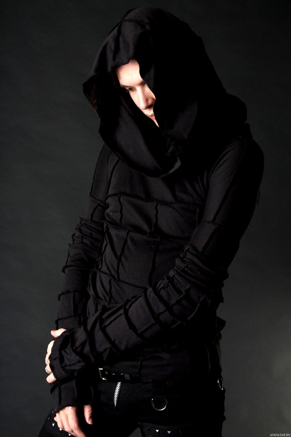 hooded garment with straps or bands across the torso, which could be interpreted as an alternative fashion choice. The person has