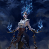 a dark background with stars visible in the sky. Her pose suggests she may be performing or preparing for battle. The style of the artwork is fantasy-themed, indicative of a character from a video game,