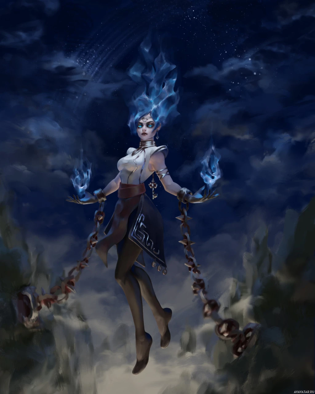 a female character with blue hair, wearing an elaborate costume that includes chains and other embellishments. She is set against