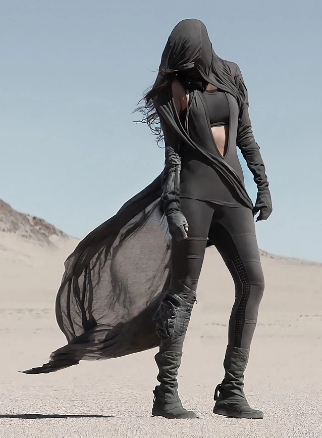 an air of mystery or secrecy to their appearance. They are standing in a desert-like environment with