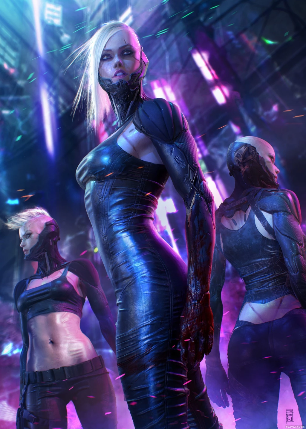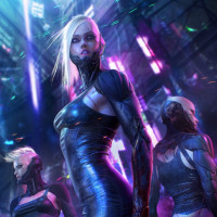 a cyberpunk aesthetic. One figure is prominently positioned forward, looking towards the viewer, while the other two are slightly behind her, also facing towards the camera. The style of the image suggests it could be related to science fiction media such as