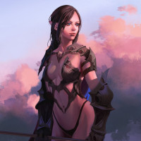 a skilled fighter or guardian. The background features a soft sky transitioning to clouds and foliage, providing