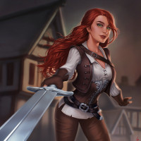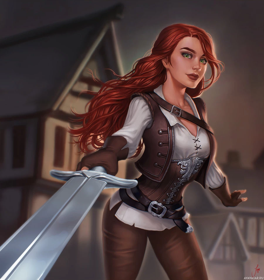 На картинке изображена женщина с рыжими волосами в средневековой одежде, включая корсет и брюки, и с мечом в левой руке. Она, кажется, стоит на открытом воздухе, что предполагает историческую или фэнтезийную среду, возможно, из видеоигры или мультсериала.