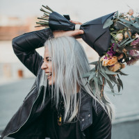 a bouquet of flowers above her head, which suggests she might have just received them or is carrying them for someone else. The background is not very distinct, but it seems like