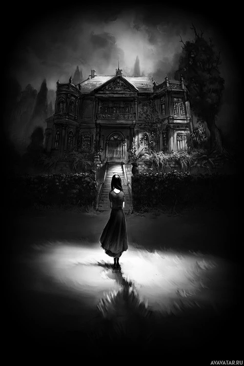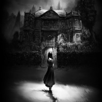a young girl standing in front of an eerie, crumbling mansion at night. She is wearing a long dress and seems to be gazing towards the mansion with