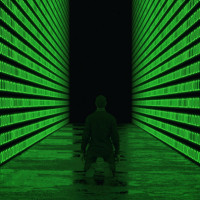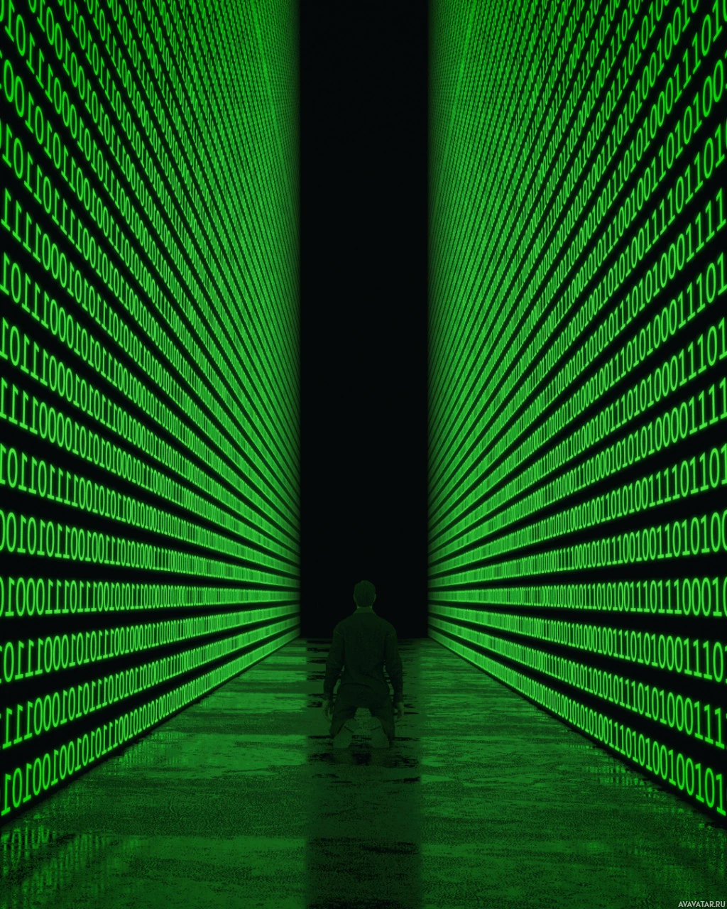 Картинка показывает человека, стоящего в одиночестве в обширном коридоре, заполненном рядами трехмерных цифровых дисплеев с зеленым светом, показывающих двоичный код. Сцена предполагает футуристическую или передовую технологическую обстановку.