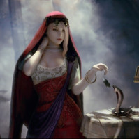 a young woman with blonde hair, wearing what looks like a medieval or fantasy-style outfit. She has a snake wrapped around her arm, which adds an unusual and possibly symbolic element to the scene. In front of her is a table set with