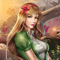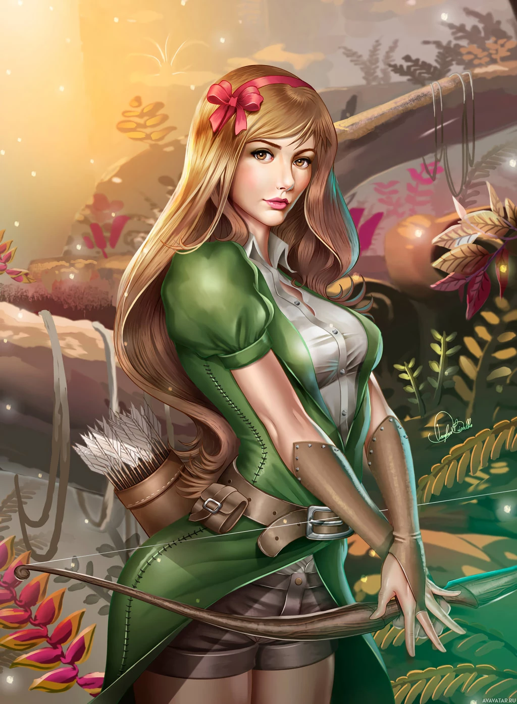 blonde hair, wearing a green dress with a bow at her waist and carrying a bow and arrow. Her expression is confident, as if she's ready for an adventure. The background features
