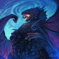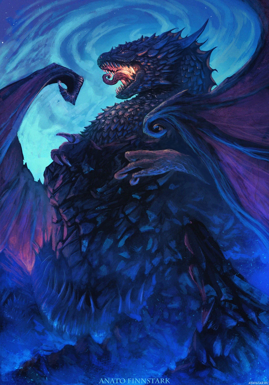 an intense expression, possibly roaring or showing its teeth, which adds to the fierce and mythological appearance of the monster. The artwork has a dark blue tone and features what appears to be magical elements in the background, such as stars and