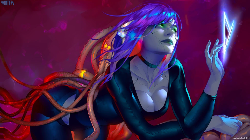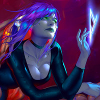 In the image, there is a character who appears to be female. She has blue hair and what seems to be a fantastical or