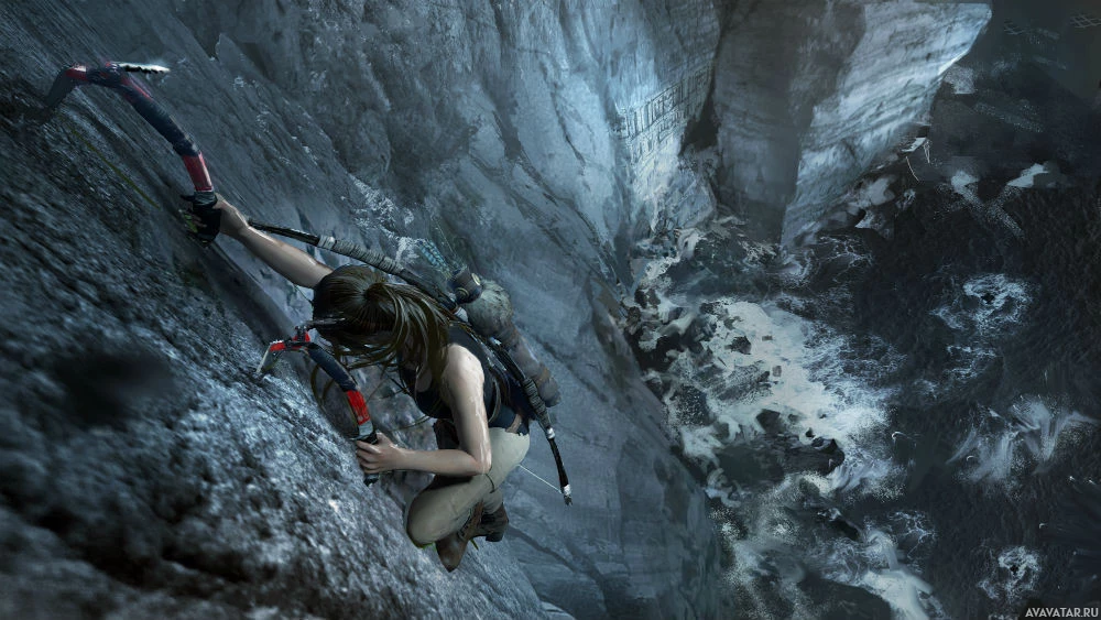 game series "Tomb Raider." She is shown in a mountainous environment with steep cliffs and