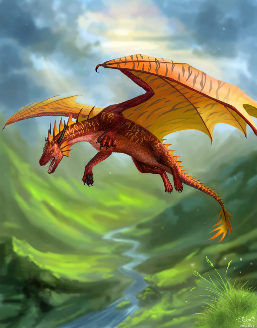 green hills, trees, and a river below. The dragon has reddish-