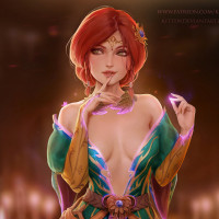 Triss Merigold from the "The Witcher" series, which is based on the book series "The Witcher" by Andrzej Sapkowski. The character depicted has striking