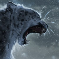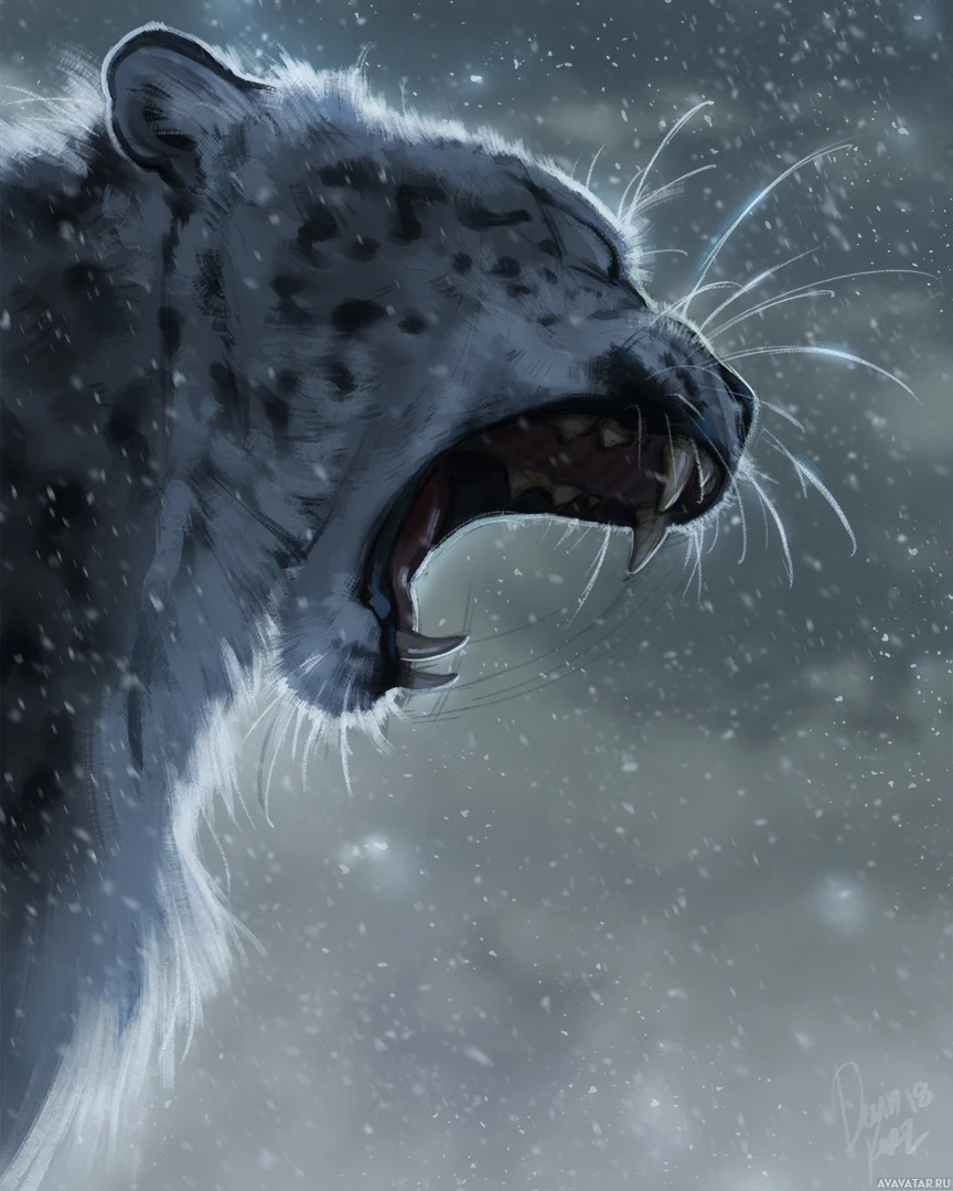 На картинке изображен снежный барс в зимней обстановке. Шерсть животного преимущественно белая с более темными отметинами, характерными для вида. У него открыт рот, как будто он ревет или вокалирует, и в воздухе видны снежинки, указывающие на то, что может идти снег. Общее настроение изображения предполагает чувство силы и величия, связанное с естественной средой обитания снежного барса.