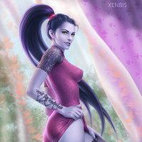 pink dress, thigh-high black socks, and has her hair styled in a braided hairstyle with a side swept fringe. The background has a stylized,