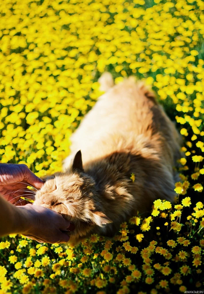 yellow flowers. It appears to be an interaction between the human and the cat, possibly for petting or feeding the cat with some type of treat that has been held out by the person's hand.
