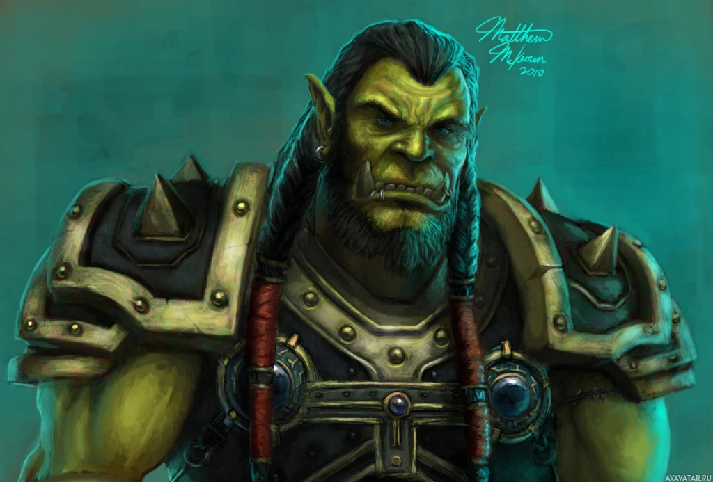На картинке изображен персонаж-орк из игры «Warcraft». Этот персонаж примечателен своей пугающей внешностью, в том числе большим строением, видными бивнями и светящимися глазами. Он носит доспехи с шипами, что добавляет ему угрожающего вида.