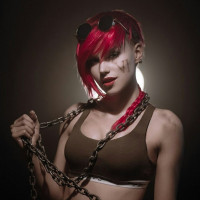 red hair styled in a manner consistent with Vi's appearance, and they are holding the chain across their body. The setting appears to be