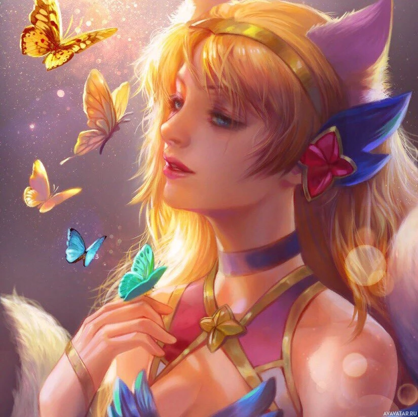 The image features an illustrated character with a blonde hair, wearing what appears to be a fantasy-style outfit with wings and ears that resemble those of a butterfly or fairy. She is surrounded by several butterflies in flight, which adds to the whimsical and enchanting atmosphere of the illustration.
