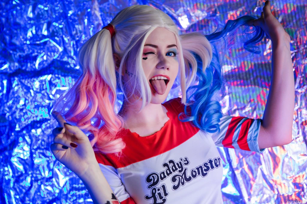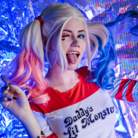Harley Quinn is a character from the "Batman" series, known for her distinctive appearance with pink and blue hair, face paint, and a costume consisting of a red and white jester-like outfit with a black collar and belt. The individual in the image appears to be posing with