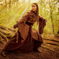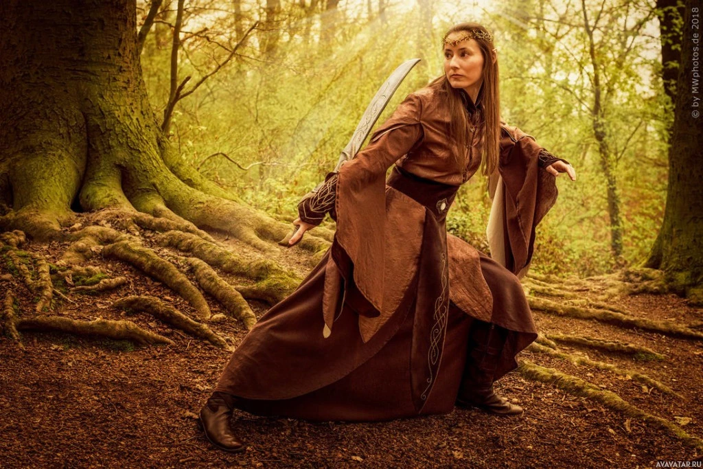 The image depicts a person dressed in fantasy-style clothing, resembling the attire of an elf or similar